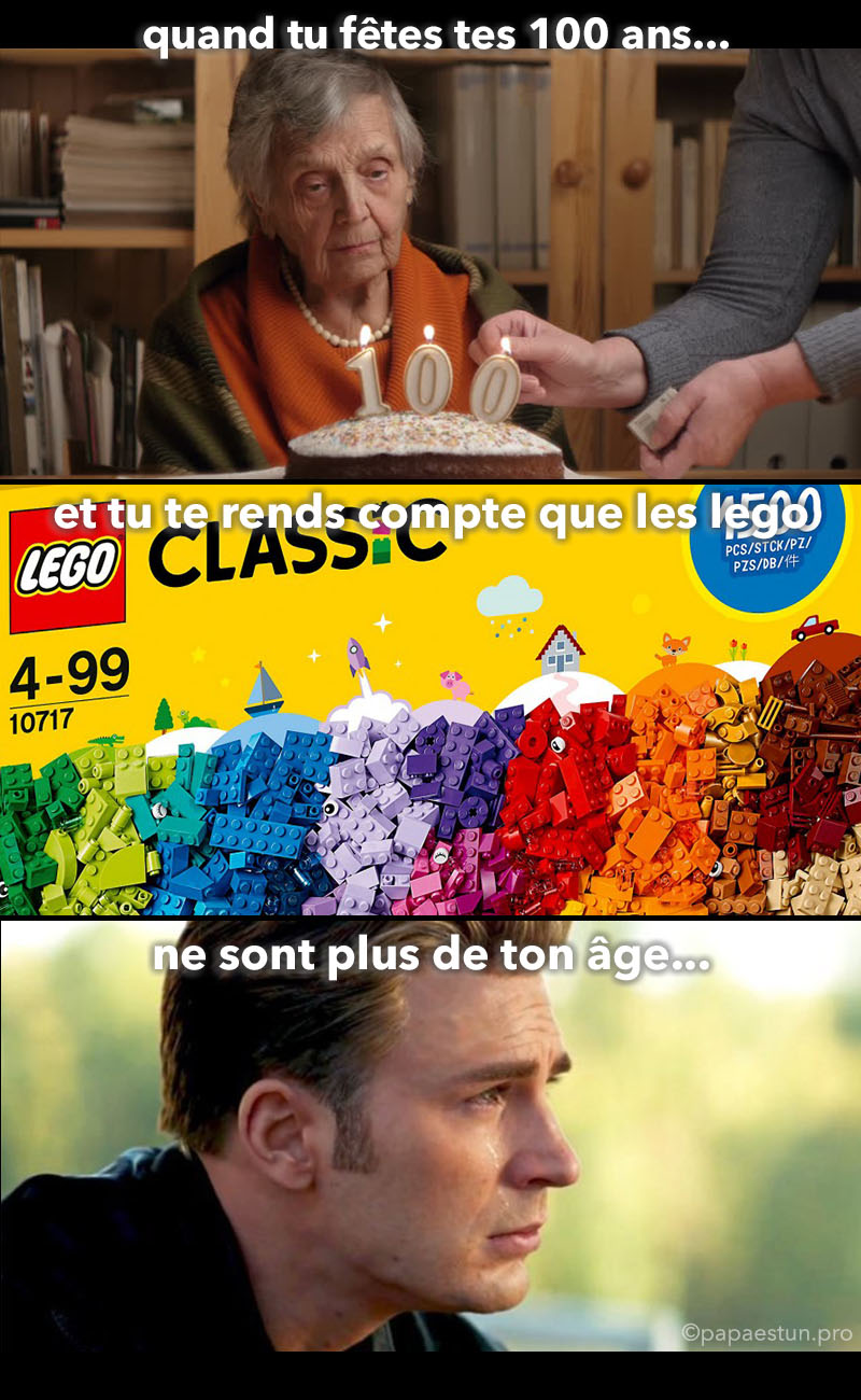 ce meme date de 3 ou 4 ans, quand une jeune femme a posté quelques images de l'anniversaire de sa grand-mère qui avait maintenant 100 ans... ce n'est pas tant l'anniversaire qui devient viral que le meme qui a suivi... celui des lego.et biensûr il fallait que je mettes ça à jour... juste pour dire... Read more